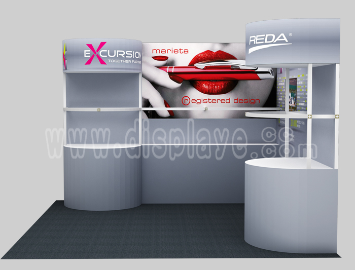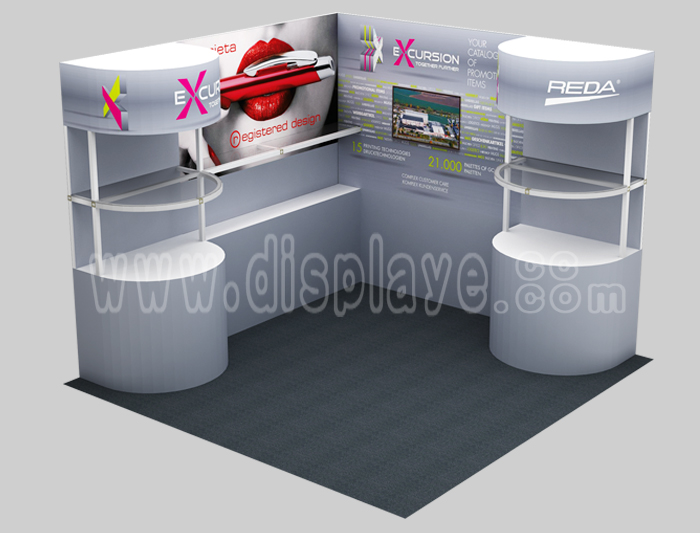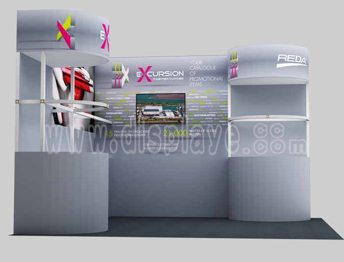 溫馨提示:如你想?yún)⒄者@設(shè)計(jì)圖DIY設(shè)計(jì)構(gòu)思你想要的展臺(tái),此造型結(jié)構(gòu)適用3x3m以下方形展位,你可增加你想要的展示功能或更多的引人注目特裝造型。
