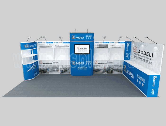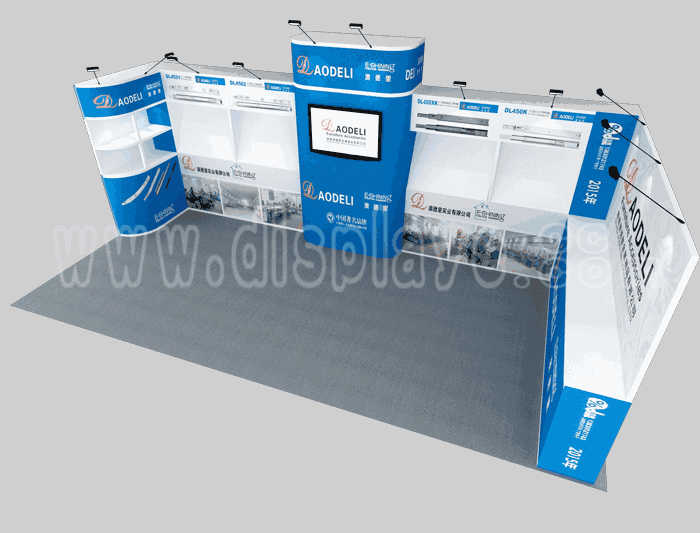 如你想?yún)⒄者@設計圖DIY設計構思你想要的展臺,此造型結構適用3x6m以下方形展位,你可增加你想要的展示功能或更多的引人注目特裝造型。