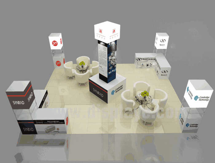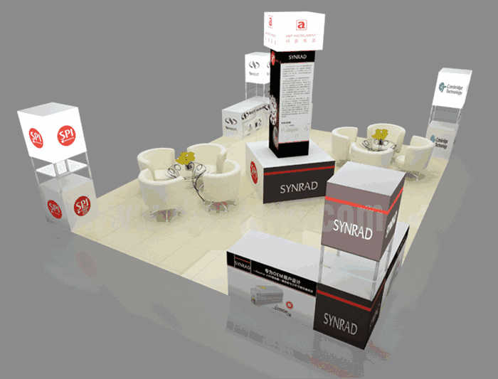 如你想?yún)⒄者@設(shè)計(jì)圖DIY設(shè)計(jì)構(gòu)思你想要的展臺(tái),此造型結(jié)構(gòu)適用10x10m以下方形展位,你可增加你想要的展示功能或更多的引人注目特裝造型。