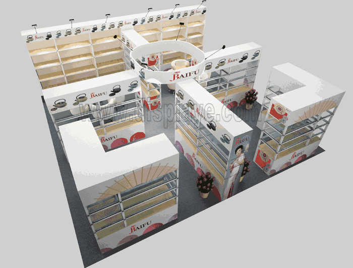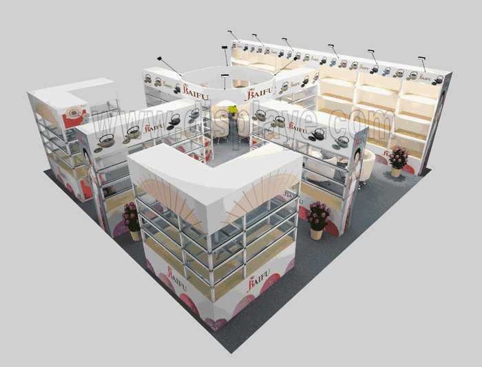 如你想?yún)⒄者@設(shè)計(jì)圖DIY設(shè)計(jì)構(gòu)思你想要的展臺(tái),此造型結(jié)構(gòu)適用6x6m以下方形展位,你可增加你想要的展示功能或更多的引人注目特裝造型。