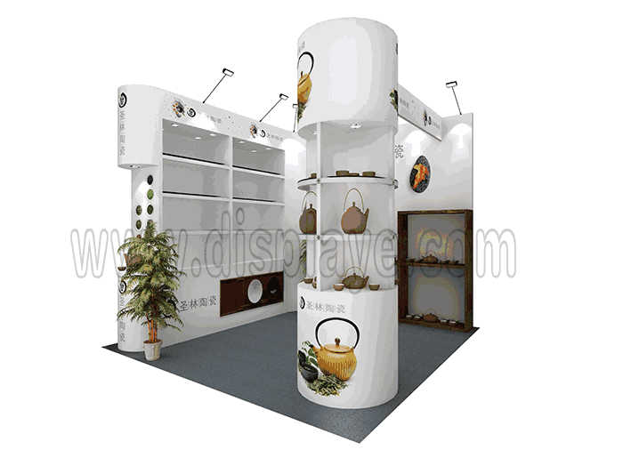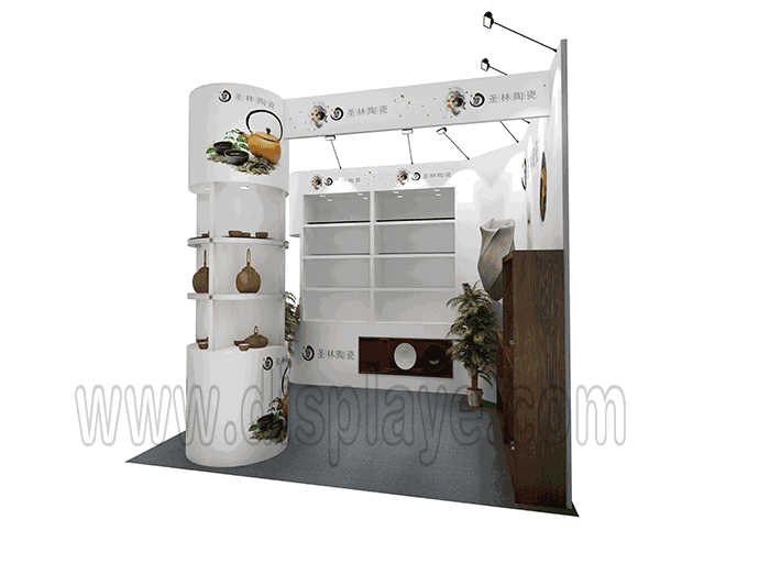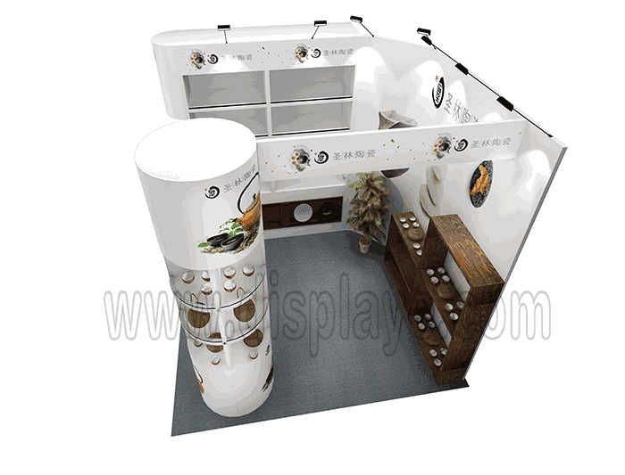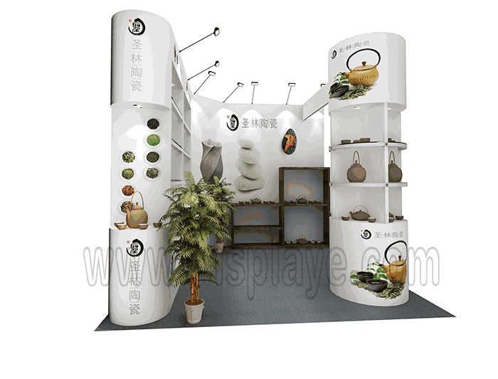 溫馨提示:如你想?yún)⒄者@設(shè)計圖DIY設(shè)計構(gòu)思你想要的展臺,此造型結(jié)構(gòu)適用3x3m以下方形展位,你可增加你想要的展示功能或更多的引人注目特裝造型。