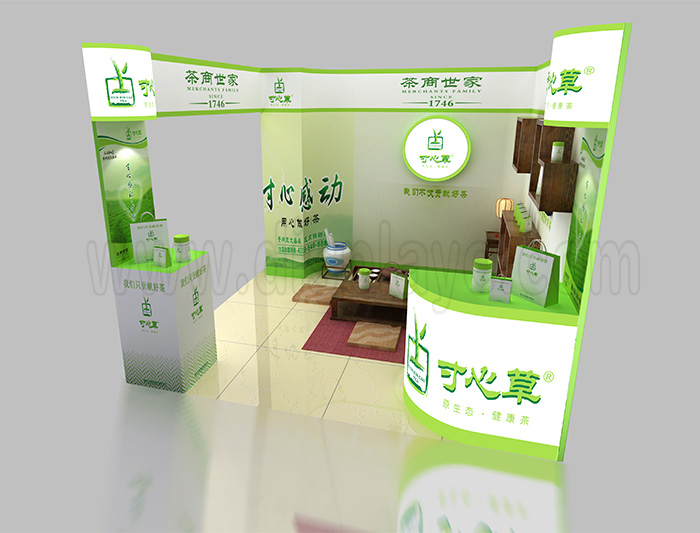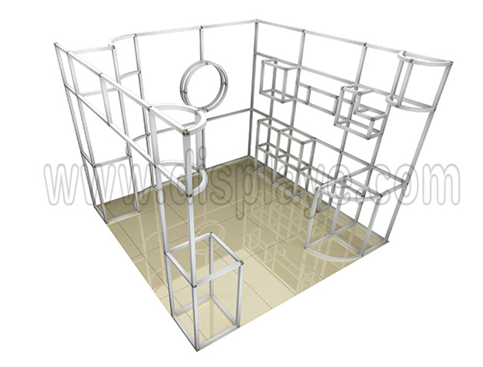 溫馨提示:如你想?yún)⒄者@設(shè)計(jì)圖DIY設(shè)計(jì)構(gòu)思你想要的百變展臺(tái),此造型結(jié)構(gòu)適用3x3m以下方形展位,你可增加你想要的展示功能或更多的引人注目特裝造型。