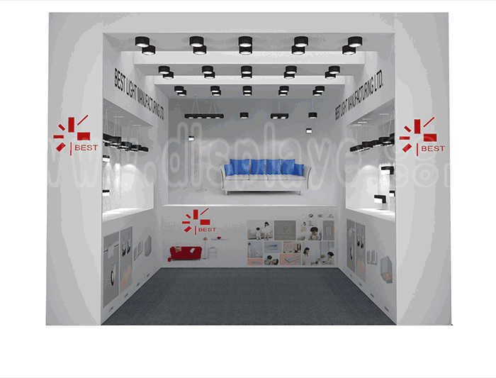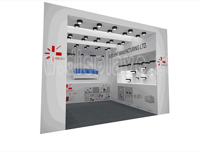 溫馨提示:如你想?yún)⒄者@設(shè)計(jì)圖DIY設(shè)計(jì)構(gòu)思你想要的展臺(tái),此造型結(jié)構(gòu)適用3x3m以下方形展位,你可增加你想要的展示功能或更多的引人注目特裝造型。