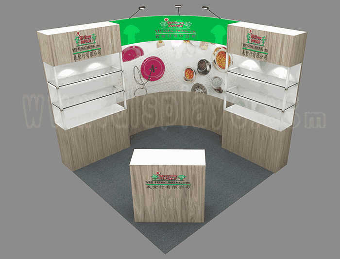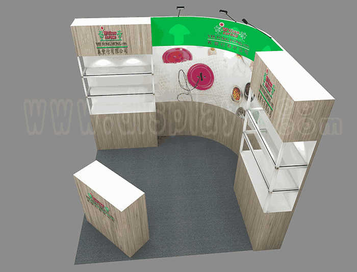 溫馨提示:如你想?yún)⒄者@設(shè)計(jì)圖DIY設(shè)計(jì)構(gòu)思你想要的展臺(tái),此造型結(jié)構(gòu)適用3x3m以下方形展位,你可增加你想要的展示功能或更多的引人注目特裝造型。
