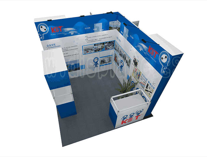 溫馨提示:如你想?yún)⒄者@設(shè)計圖DIY設(shè)計構(gòu)思你想要的展臺,此造型結(jié)構(gòu)適用3x3m以下方形展位,你可增加你想要的展示功能或更多的引人注目特裝造型。