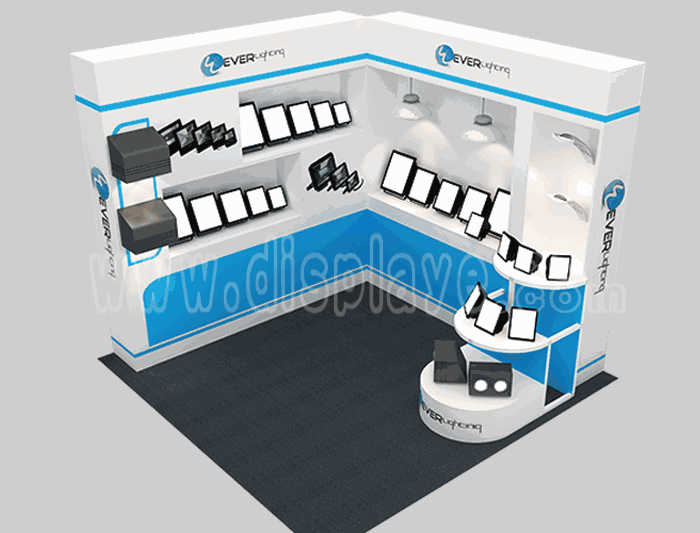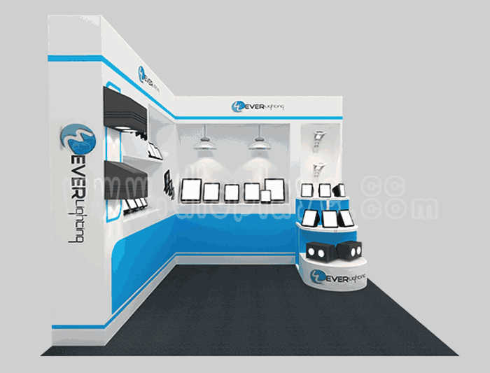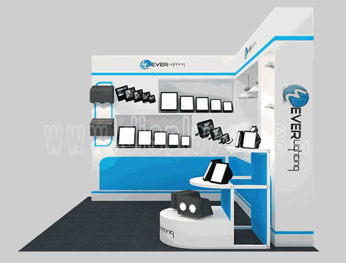 溫馨提示:如你想?yún)⒄者@設(shè)計圖DIY設(shè)計構(gòu)思你想要的展臺,此造型結(jié)構(gòu)適用3x3m以下方形展位,你可增加你想要的展示功能或更多的引人注目特裝造型。