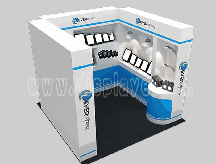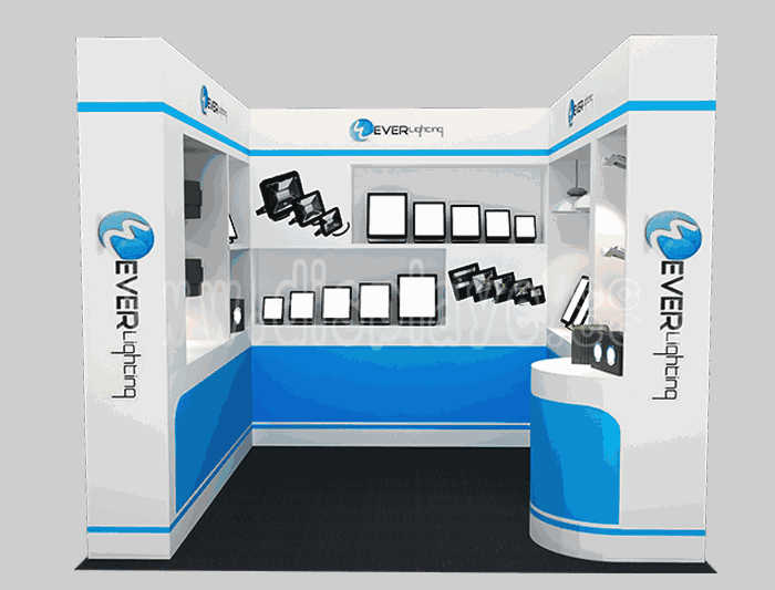 溫馨提示:如你想?yún)⒄者@設(shè)計圖DIY設(shè)計構(gòu)思你想要的展臺,此造型結(jié)構(gòu)適用3x3m以下方形展位,你可增加你想要的展示功能或更多的引人注目特裝造型。