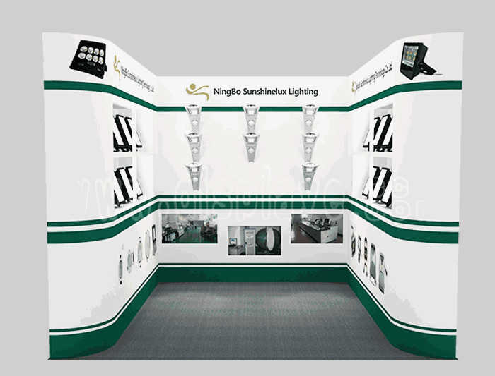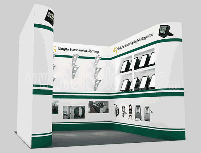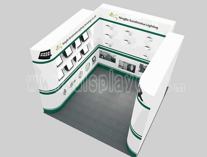 溫馨提示:如你想?yún)⒄者@設計圖DIY設計構思你想要的展臺,此造型結構適用3x3m以下方形展位,你可增加你想要的展示功能或更多的引人注目特裝造型。