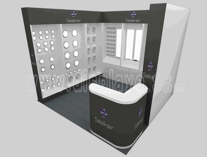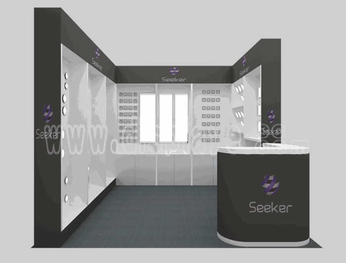 溫馨提示:如你想?yún)⒄者@設(shè)計(jì)圖DIY設(shè)計(jì)構(gòu)思你想要的展臺,此造型結(jié)構(gòu)適用3x3m以下方形展位,你可增加你想要的展示功能或更多的引人注目特裝造型。