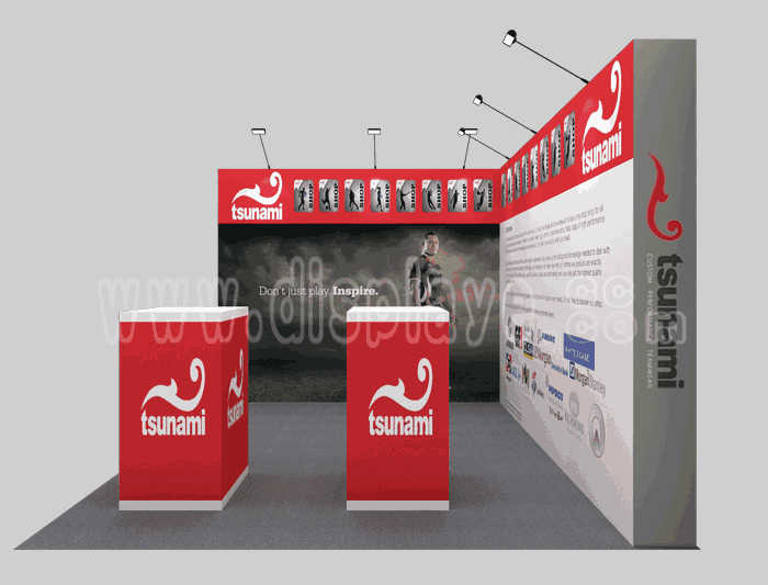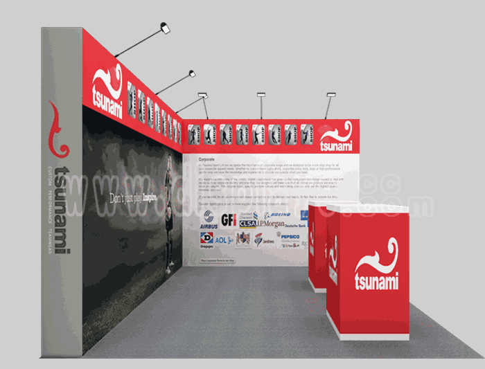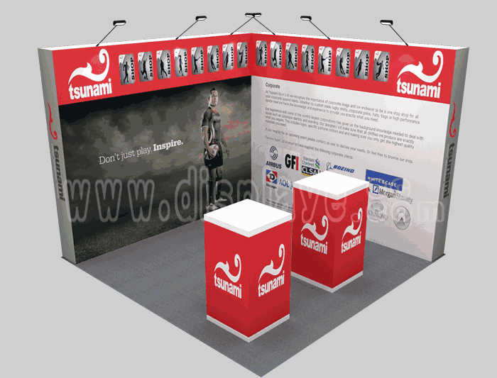 溫馨提示:如你想?yún)⒄者@設(shè)計圖DIY設(shè)計構(gòu)思你想要的展臺,此造型結(jié)構(gòu)適用3x3m以下方形展位,你可增加你想要的展示功能或更多的引人注目特裝造型。