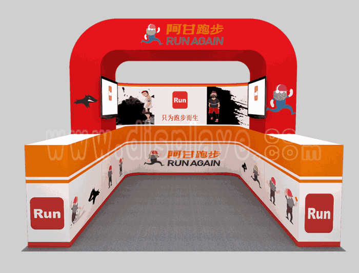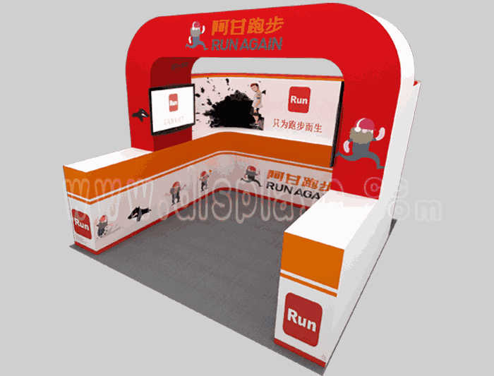 溫馨提示:如你想?yún)⒄者@設(shè)計圖DIY設(shè)計構(gòu)思你想要的展臺,此造型結(jié)構(gòu)適用3x3m以下方形展位,你可增加你想要的展示功能或更多的引人注目特裝造型。