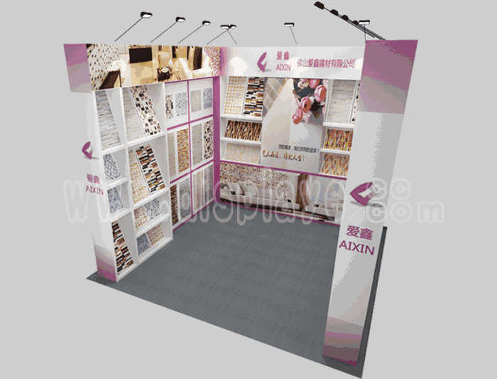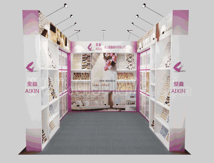溫馨提示:如你想?yún)⒄者@設(shè)計圖DIY設(shè)計構(gòu)思你想要的展臺,此造型結(jié)構(gòu)適用3x3m以下方形展位,你可增加你想要的展示功能或更多的引人注目特裝造型。