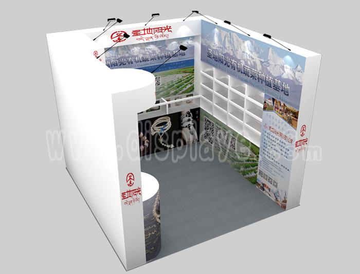 溫馨提示:如你想?yún)⒄者@設(shè)計圖DIY設(shè)計構(gòu)思你想要的展臺,此造型結(jié)構(gòu)適用3x3m以下方形展位,你可增加你想要的展示功能或更多的引人注目特裝造型。