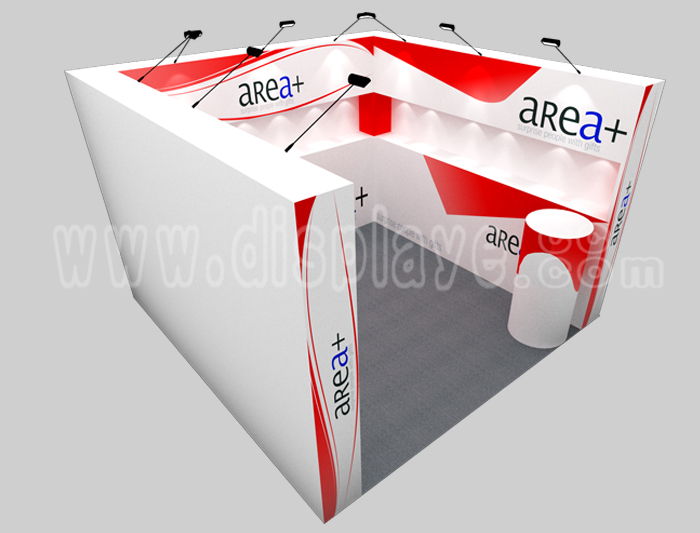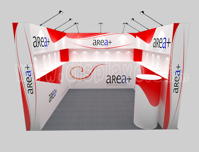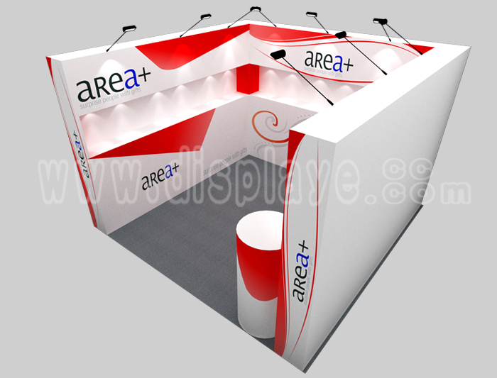 溫馨提示:如你想?yún)⒄者@設(shè)計圖DIY設(shè)計構(gòu)思你想要的展臺,此造型結(jié)構(gòu)適用3x3m以下方形展位,你可增加你想要的展示功能或更多的引人注目特裝造型。