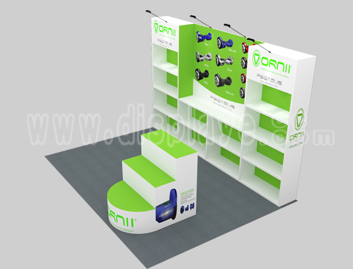 溫馨提示:如你想?yún)⒄者@設(shè)計(jì)圖DIY設(shè)計(jì)構(gòu)思你想要的展臺(tái),此造型結(jié)構(gòu)適用3x3m以下方形展位,你可增加你想要的展示功能或更多的引人注目特裝造型。