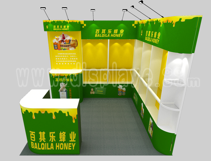 溫馨提示:如你想?yún)⒄者@設(shè)計圖DIY設(shè)計構(gòu)思你想要的展臺,此造型結(jié)構(gòu)適用3x3m以下方形展位,你可增加你想要的展示功能或更多的引人注目特裝造型。