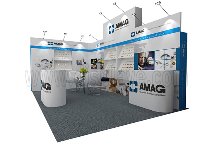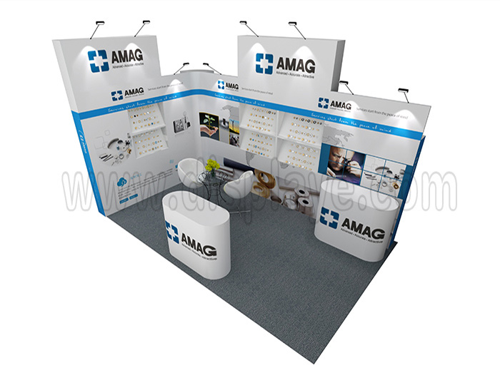 溫馨提示:如你想?yún)⒄者@設(shè)計圖DIY設(shè)計構(gòu)思你想要的展臺,此造型結(jié)構(gòu)適用3x6m以下方形展位,你可增加你想要的展示功能或更多的引人注目特裝造型。