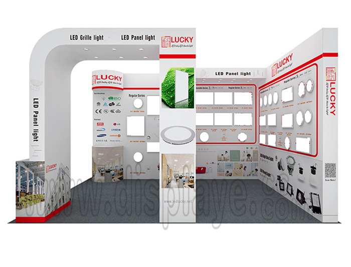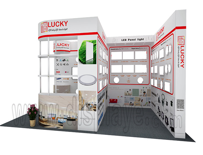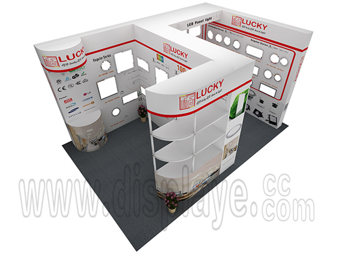 溫馨提示:如你想?yún)⒄者@設計圖DIY設計構思你想要的展臺,此造型結構適用3x6m以下方形展位,你可增加你想要的展示功能或更多的引人注目特裝造型。