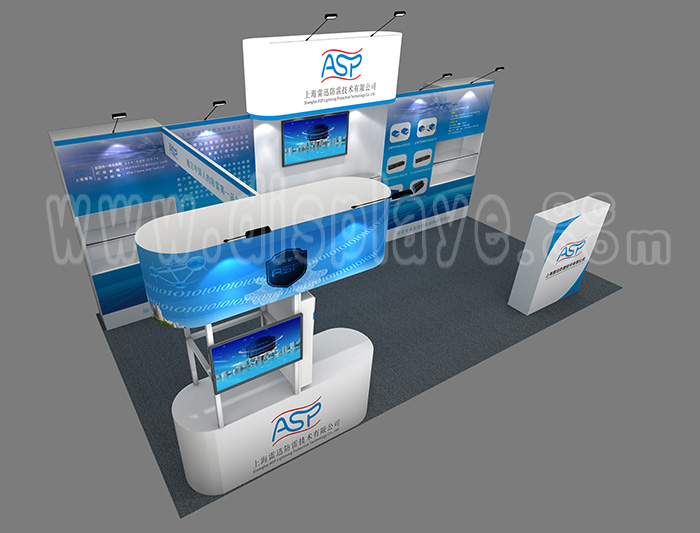 如你想?yún)⒄者@設(shè)計(jì)圖DIY設(shè)計(jì)構(gòu)思你想要的展臺(tái),此造型結(jié)構(gòu)適用3x6m以下方形展位,你可增加你想要的展示功能或更多的引人注目特裝造型。