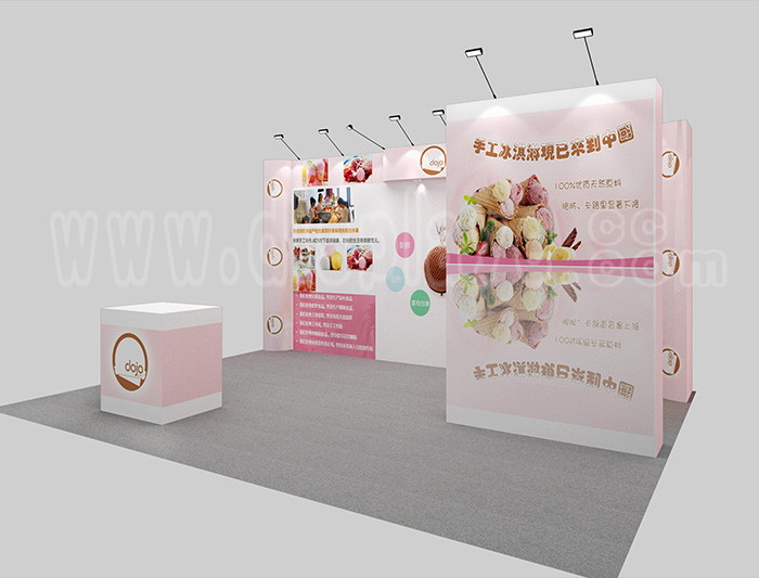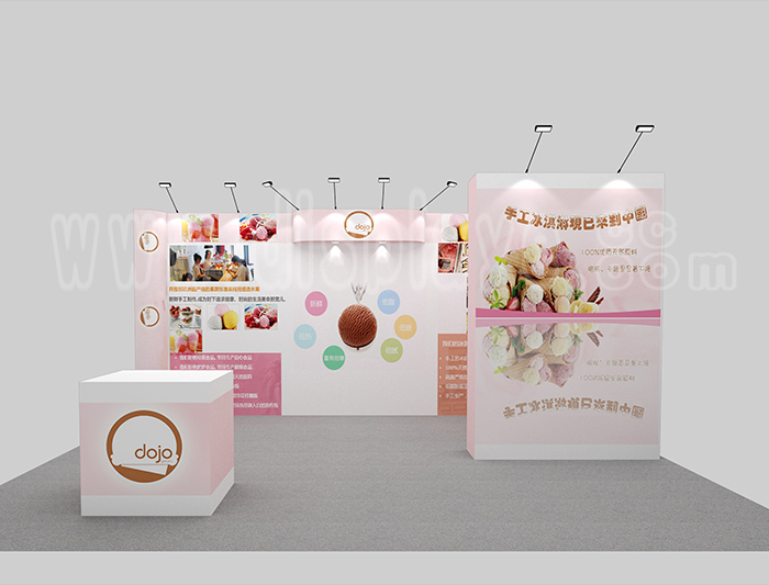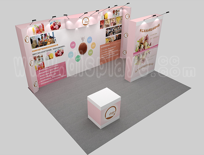 如你想?yún)⒄者@設(shè)計(jì)圖DIY設(shè)計(jì)構(gòu)思你想要的展臺(tái),此造型結(jié)構(gòu)適用3x6m以下方形展位,你可增加你想要的展示功能或更多的引人注目特裝造型。