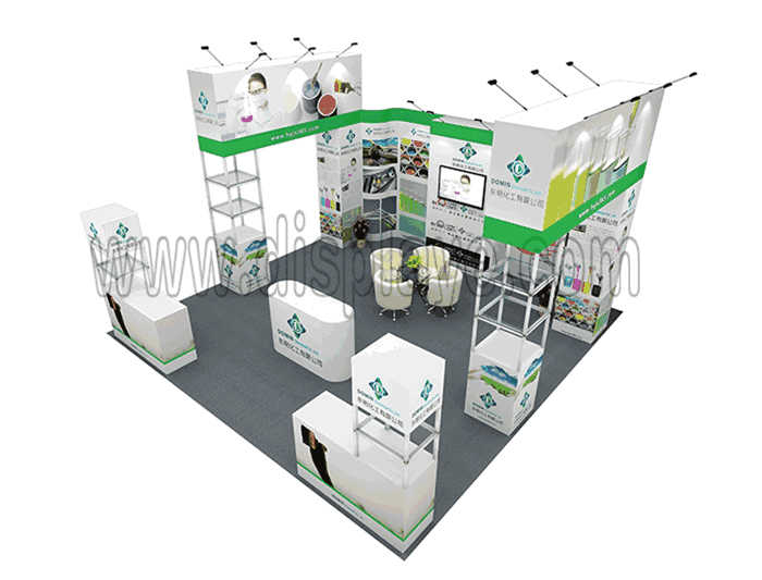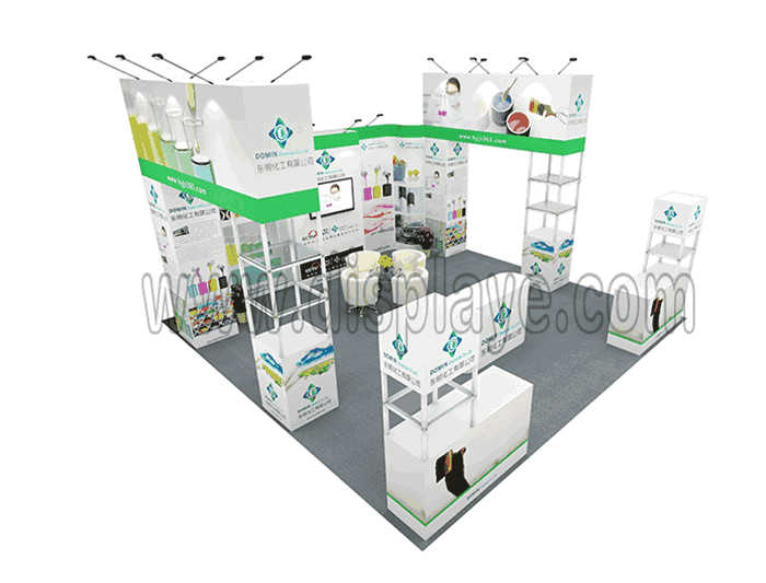 如你想?yún)⒄者@設(shè)計(jì)圖DIY設(shè)計(jì)構(gòu)思你想要的展臺(tái),此造型結(jié)構(gòu)適用6x6m以下方形展位,你可增加你想要的展示功能或更多的引人注目特裝造型。
