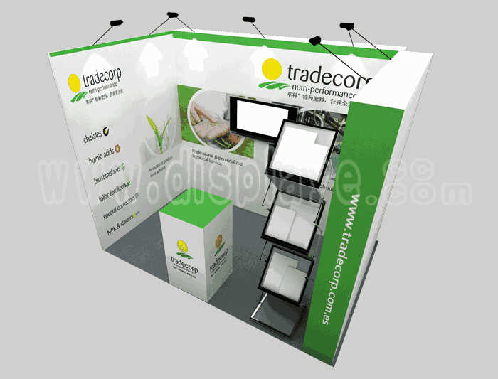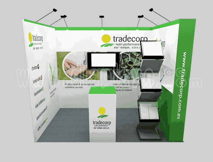 溫馨提示:如你想?yún)⒄者@設(shè)計(jì)圖DIY設(shè)計(jì)構(gòu)思你想要的展臺(tái),此造型結(jié)構(gòu)適用3x3m以下方形展位,你可增加你想要的展示功能或更多的引人注目特裝造型。