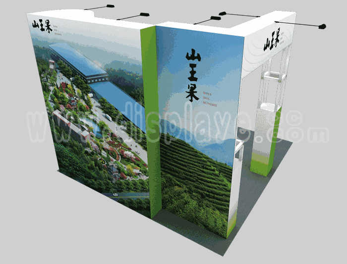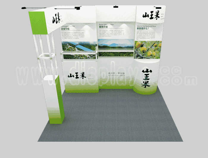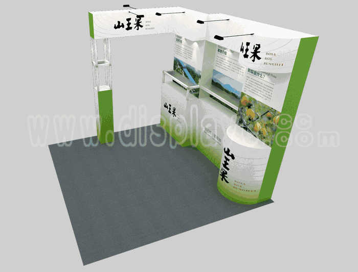 溫馨提示:如你想?yún)⒄者@設(shè)計(jì)圖DIY設(shè)計(jì)構(gòu)思你想要的展臺,此造型結(jié)構(gòu)適用3x3m以下方形展位,你可增加你想要的展示功能或更多的引人注目特裝造型。