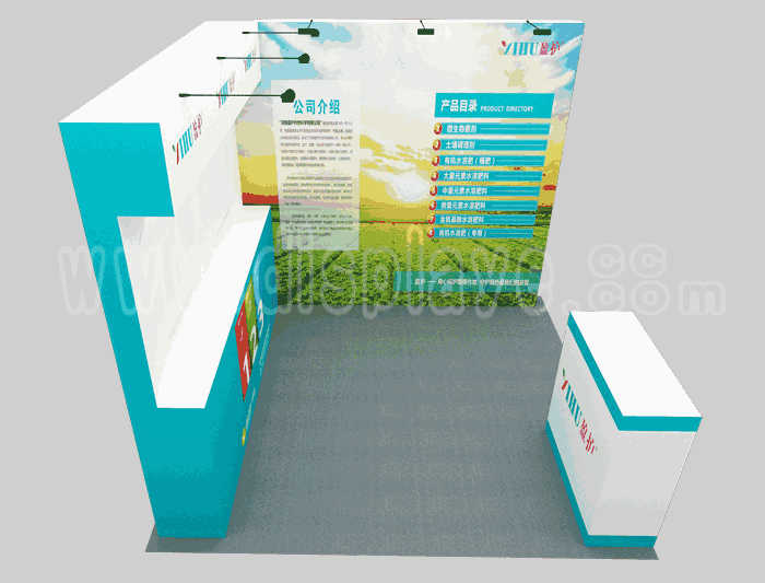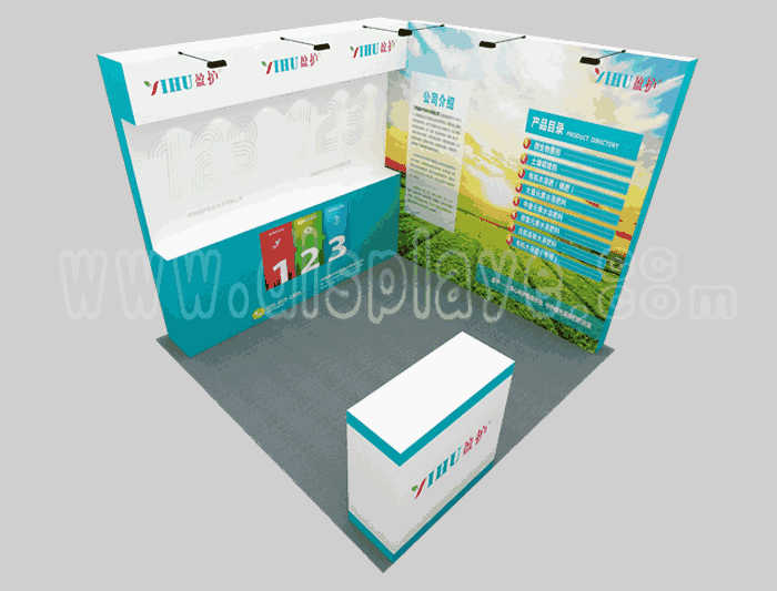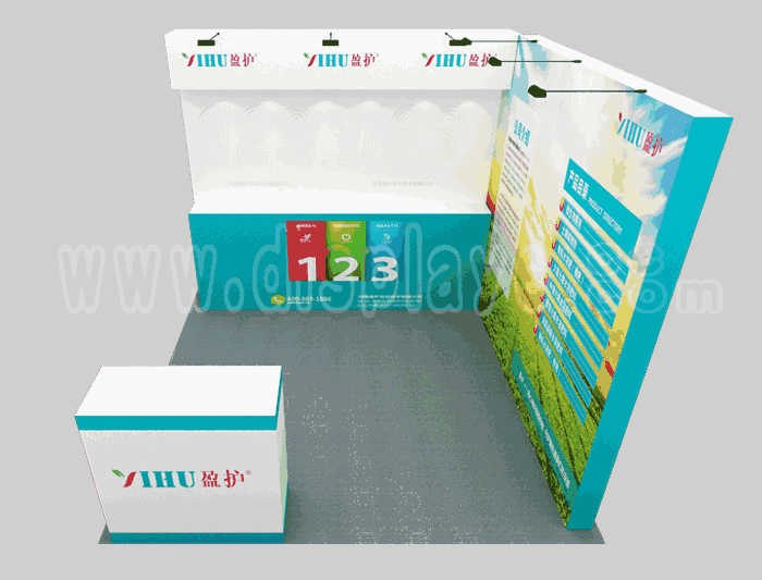 溫馨提示:如你想?yún)⒄者@設計圖DIY設計構思你想要的展臺,此造型結構適用3x3m以下方形展位,你可增加你想要的展示功能或更多的引人注目特裝造型。