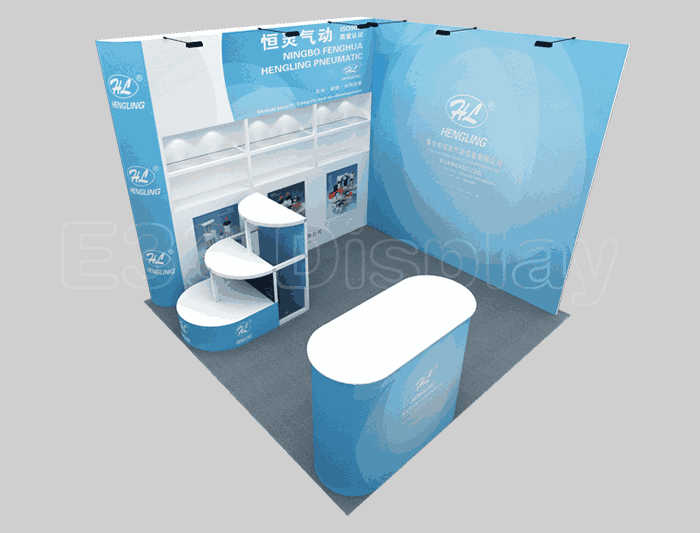 溫馨提示:如你想?yún)⒄者@設計圖DIY設計構思你想要的展臺,此造型結構適用3x3m以下方形展位,你可增加你想要的展示功能或更多的引人注目特裝造型。