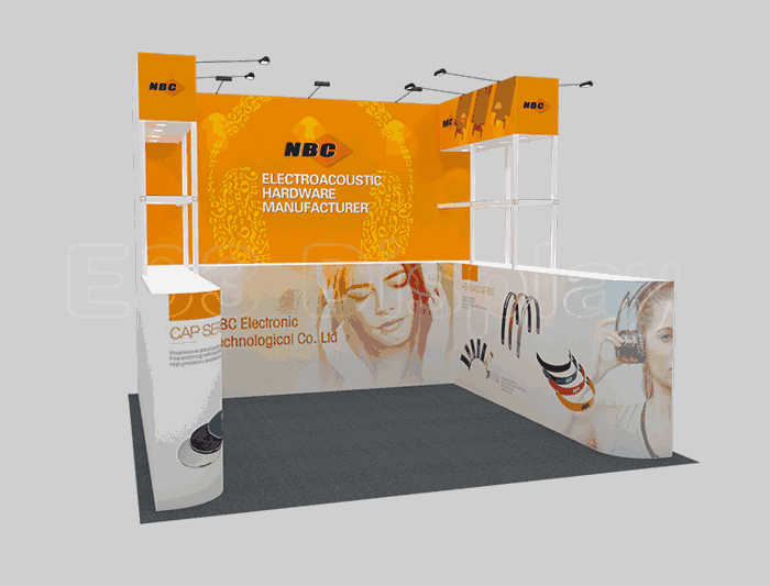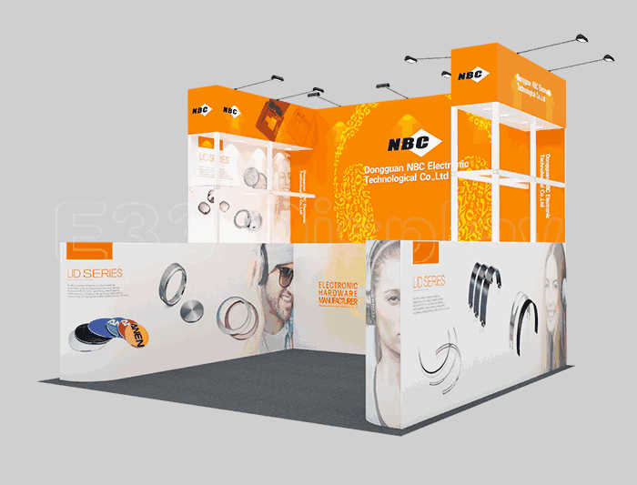 溫馨提示:如你想?yún)⒄者@設(shè)計(jì)圖DIY設(shè)計(jì)構(gòu)思你想要的展臺,此造型結(jié)構(gòu)適用3x3m以下方形展位,你可增加你想要的展示功能或更多的引人注目特裝造型。