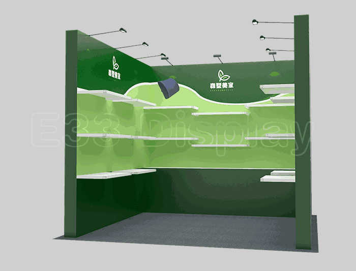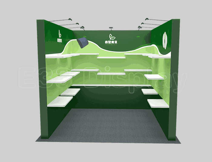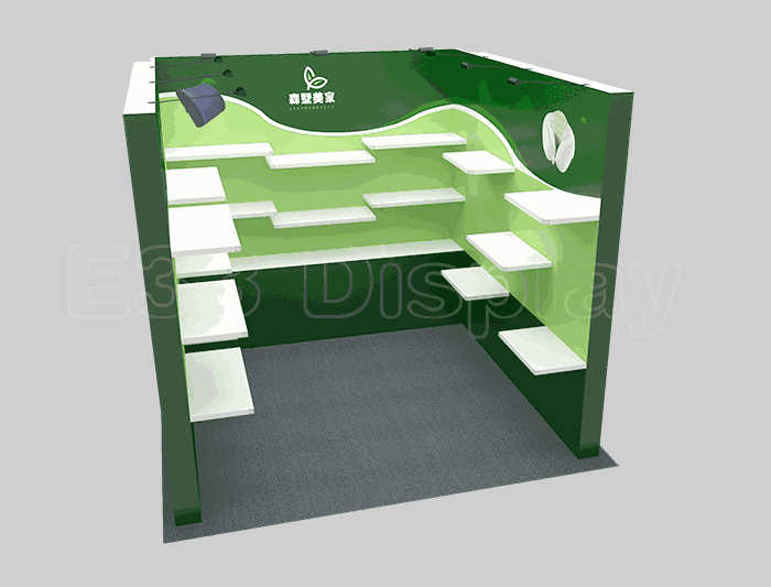 溫馨提示:如你想?yún)⒄者@設(shè)計圖DIY設(shè)計構(gòu)思你想要的展臺,此造型結(jié)構(gòu)適用3x3m以下方形展位,你可增加你想要的展示功能或更多的引人注目特裝造型。