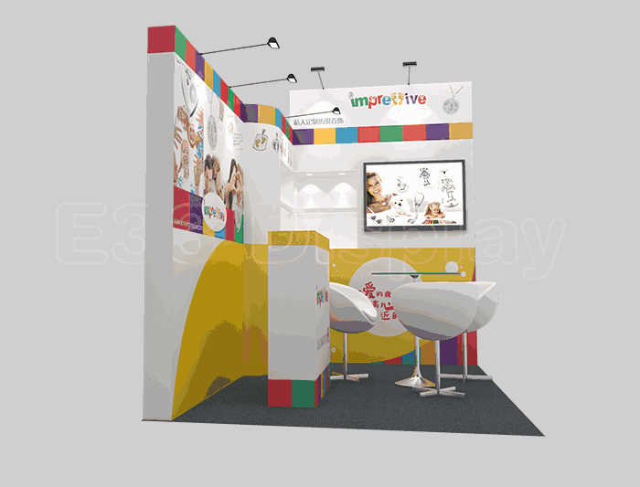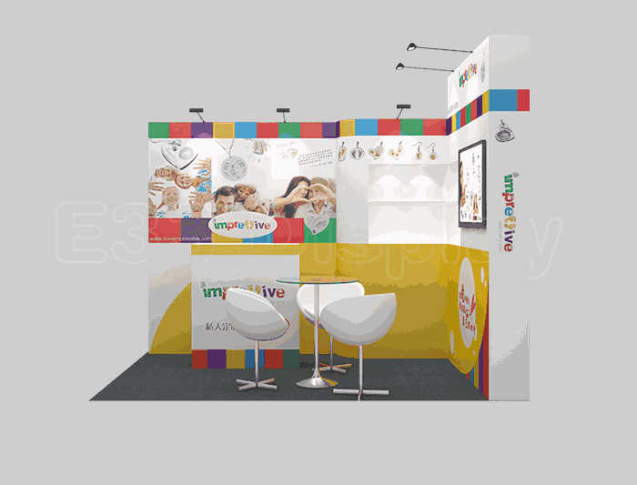 溫馨提示:如你想?yún)⒄者@設(shè)計(jì)圖DIY設(shè)計(jì)構(gòu)思你想要的展臺(tái),此造型結(jié)構(gòu)適用3x2m以下方形展位,你可增加你想要的展示功能或更多的引人注目特裝造型。