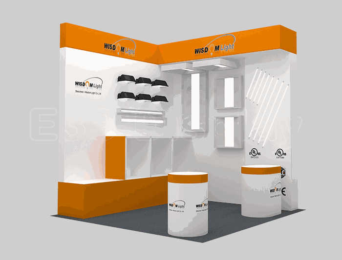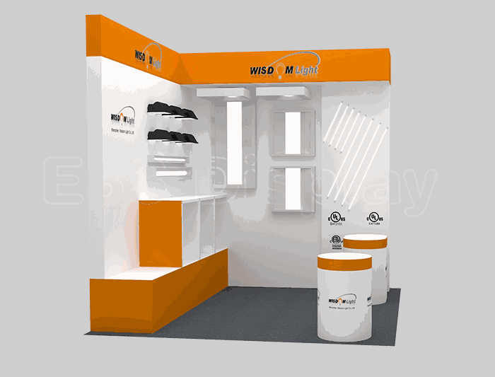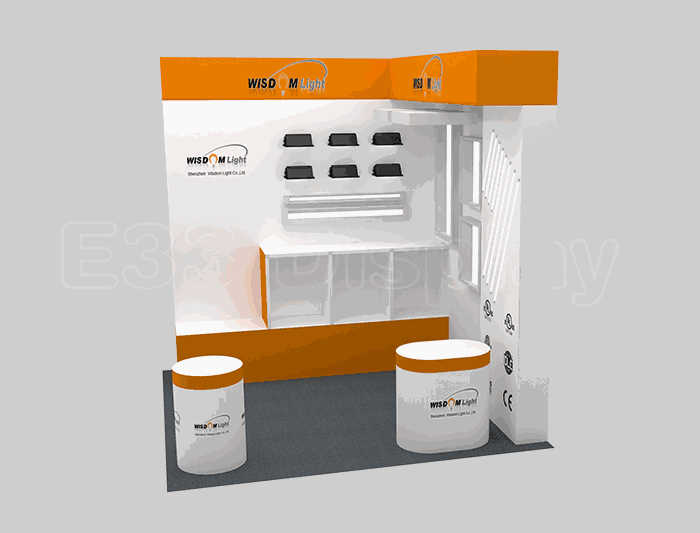 溫馨提示:如你想?yún)⒄者@設(shè)計圖DIY設(shè)計構(gòu)思你想要的展臺,此造型結(jié)構(gòu)適用3x3m以下方形展位,你可增加你想要的展示功能或更多的引人注目特裝造型。