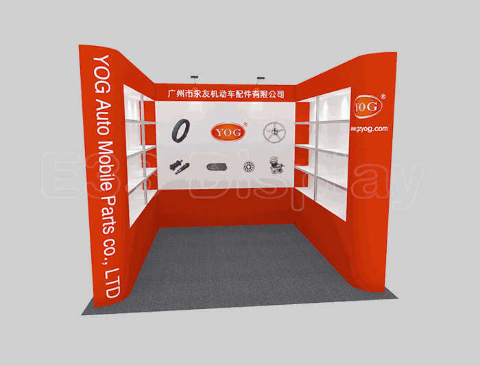 溫馨提示:如你想?yún)⒄者@設計圖DIY設計構思你想要的展臺,此造型結構適用3x3m以下方形展位,你可增加你想要的展示功能或更多的引人注目特裝造型。
