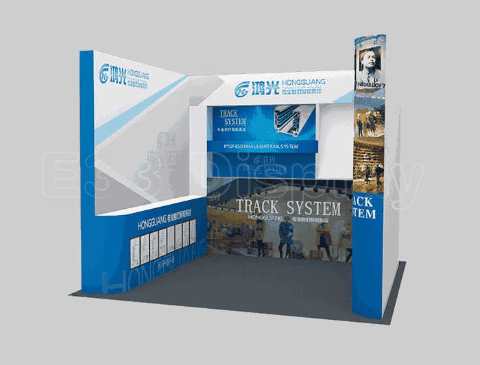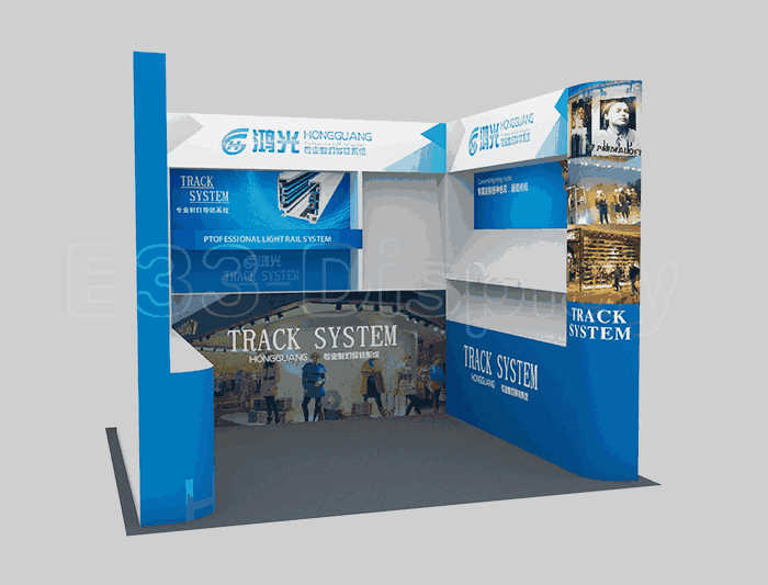 溫馨提示:如你想?yún)⒄者@設(shè)計圖DIY設(shè)計構(gòu)思你想要的展臺,此造型結(jié)構(gòu)適用3x3m以下方形展位,你可增加你想要的展示功能或更多的引人注目特裝造型。