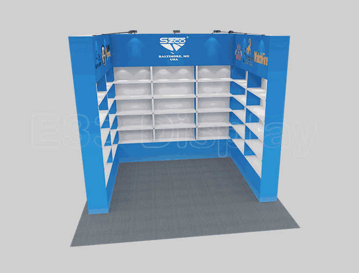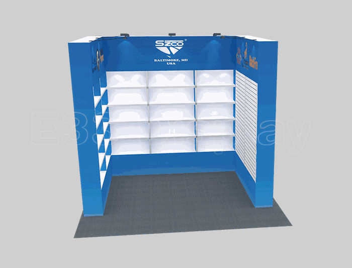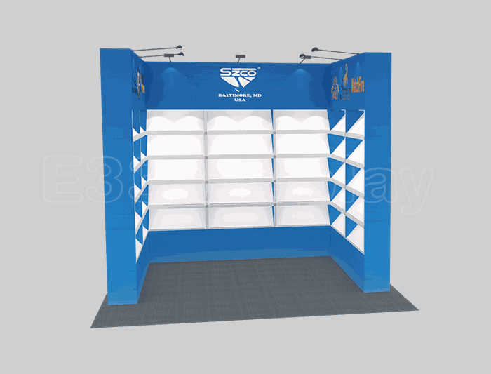溫馨提示:如你想?yún)⒄者@設(shè)計圖DIY設(shè)計構(gòu)思你想要的展臺,此造型結(jié)構(gòu)適用3x3m以下方形展位,你可增加你想要的展示功能或更多的引人注目特裝造型。