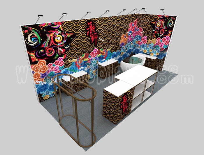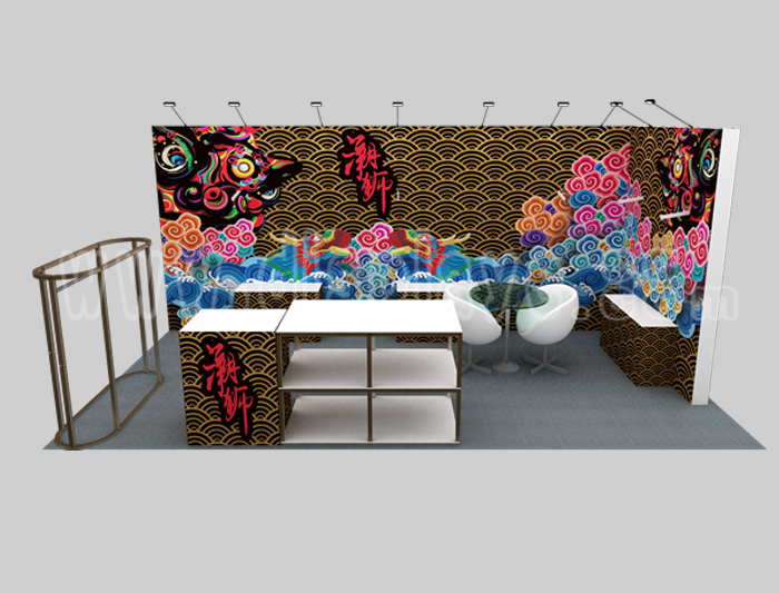 如你想?yún)⒄者@設(shè)計(jì)圖DIY設(shè)計(jì)構(gòu)思你想要的展臺(tái),此造型結(jié)構(gòu)適用3x6m以下方形展位,你可增加你想要的展示功能或更多的引人注目特裝造型。