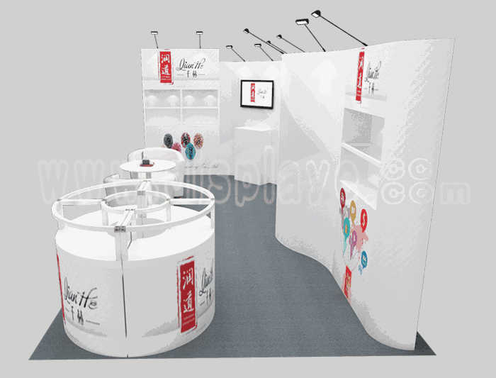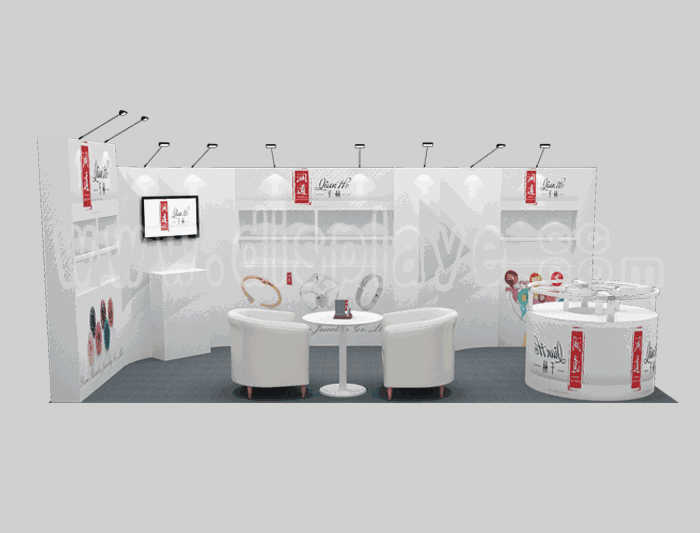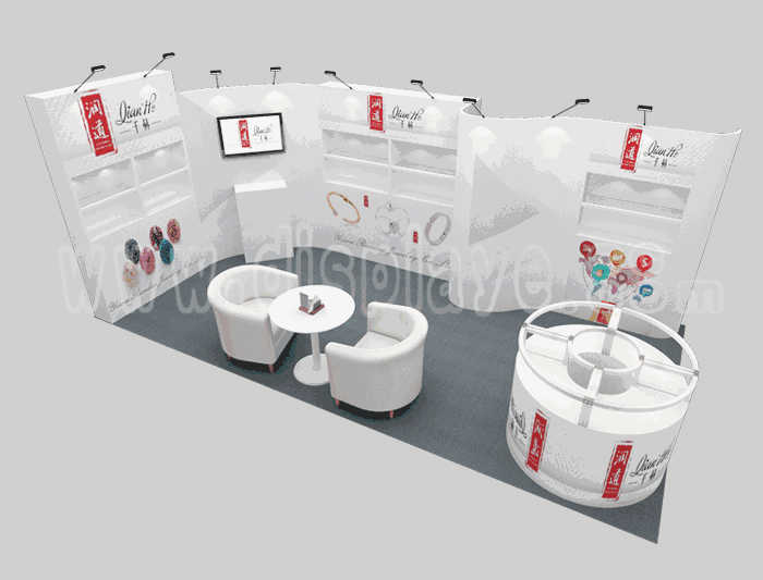 如你想?yún)⒄者@設(shè)計(jì)圖DIY設(shè)計(jì)構(gòu)思你想要的展臺(tái),此造型結(jié)構(gòu)適用3x6m以下方形展位,你可增加你想要的展示功能或更多的引人注目特裝造型。