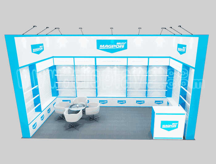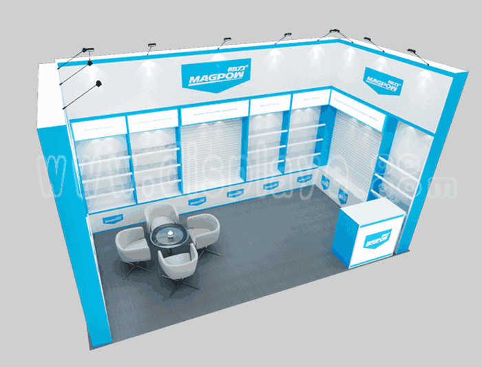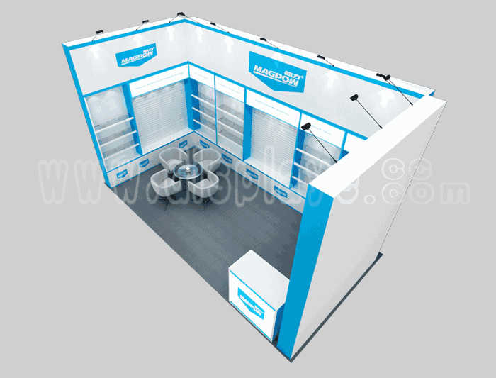 如你想?yún)⒄者@設(shè)計圖DIY設(shè)計構(gòu)思你想要的展臺,此造型結(jié)構(gòu)適用3x6m以下方形展位,你可增加你想要的展示功能或更多的引人注目特裝造型。