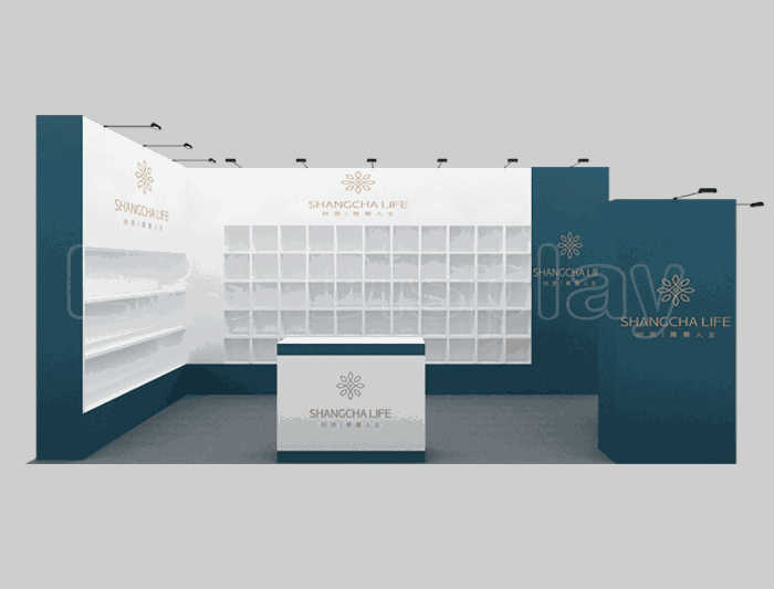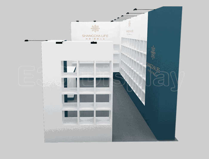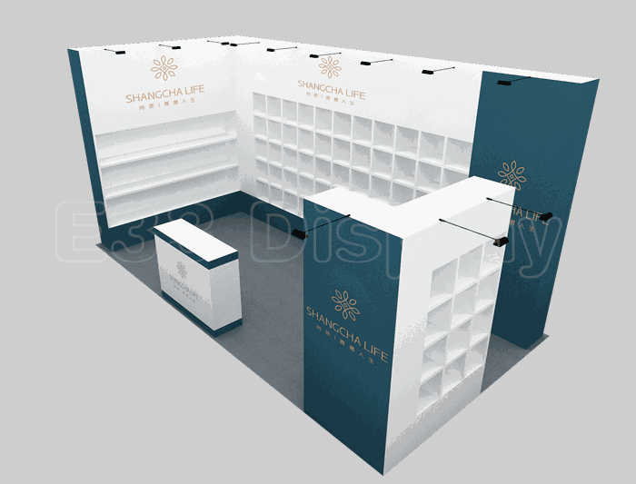 如你想?yún)⒄者@設計圖DIY設計構思你想要的展臺,此造型結構適用3x6m以下方形展位,你可增加你想要的展示功能或更多的引人注目特裝造型。