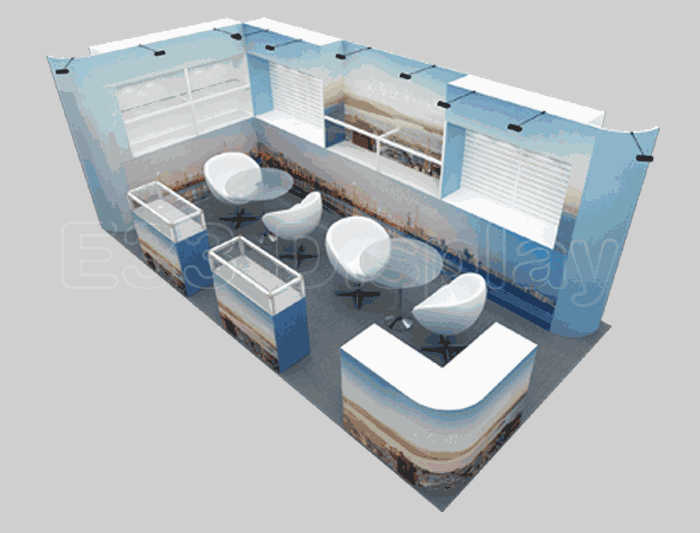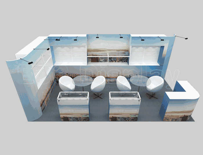 如你想?yún)⒄者@設(shè)計圖DIY設(shè)計構(gòu)思你想要的展臺,此造型結(jié)構(gòu)適用3x6m以下方形展位,你可增加你想要的展示功能或更多的引人注目特裝造型。