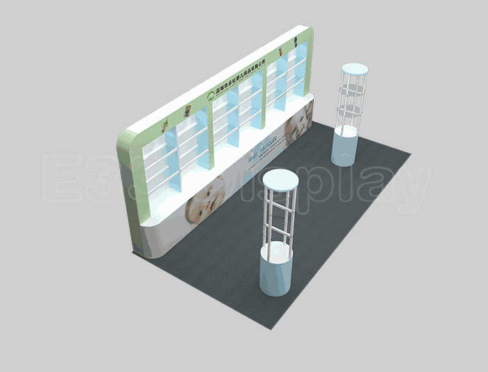 如你想?yún)⒄者@設(shè)計(jì)圖DIY設(shè)計(jì)構(gòu)思你想要的展臺(tái),此造型結(jié)構(gòu)適用3x6m以下方形展位,你可增加你想要的展示功能或更多的引人注目特裝造型。