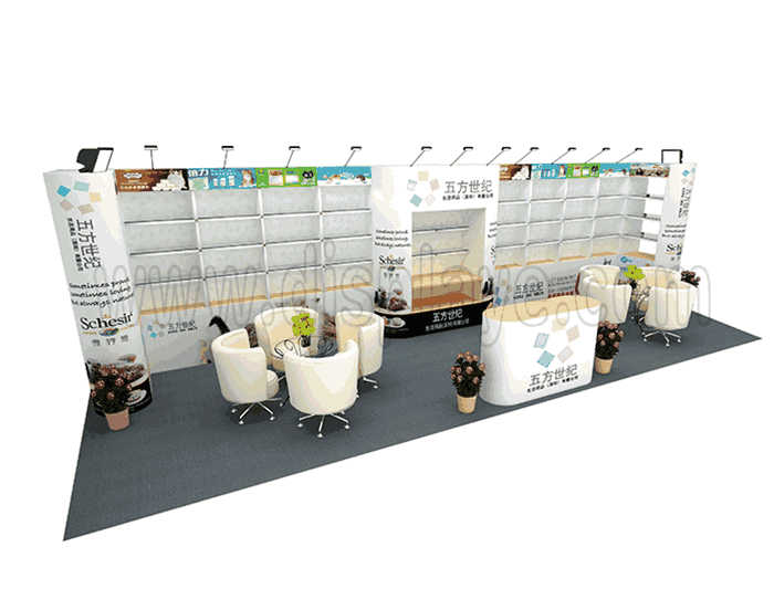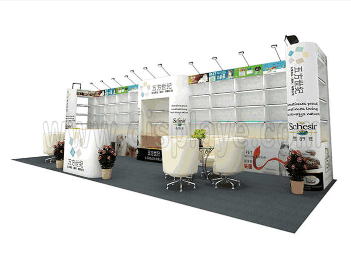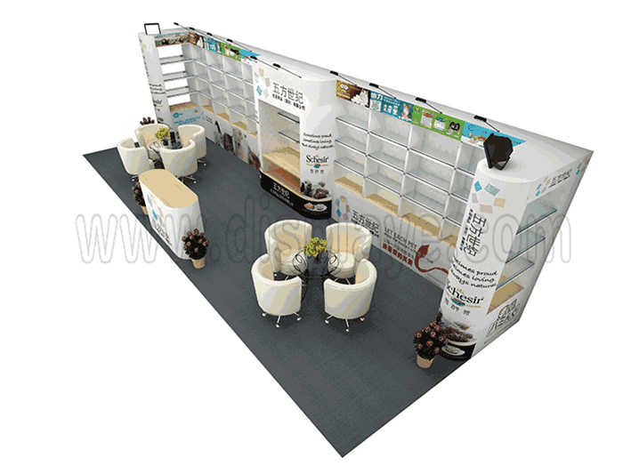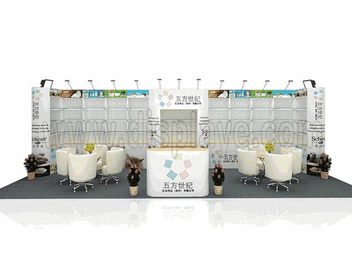 如你想?yún)⒄者@設(shè)計(jì)圖DIY設(shè)計(jì)構(gòu)思你想要的展臺,此造型結(jié)構(gòu)適用3x9m以下方形展位,你可增加你想要的展示功能或更多的引人注目特裝造型。