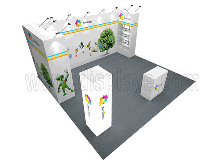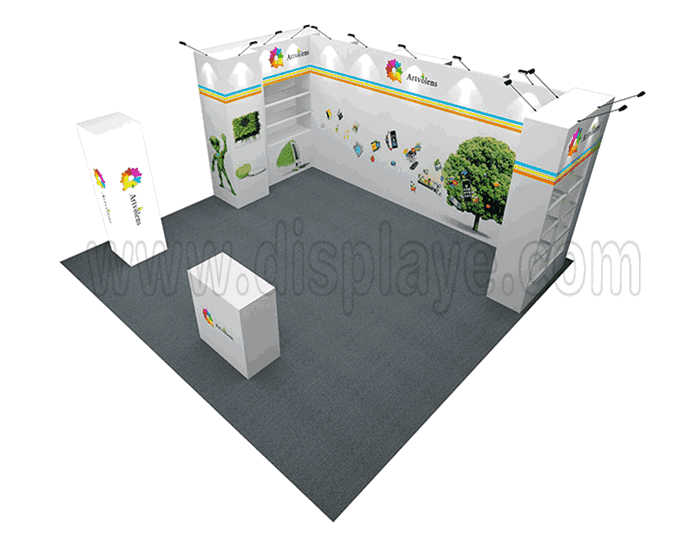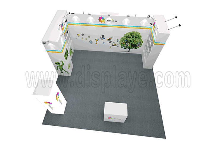 如你想?yún)⒄者@設(shè)計(jì)圖DIY設(shè)計(jì)構(gòu)思你想要的展臺(tái),此造型結(jié)構(gòu)適用6x6m以下方形展位,你可增加你想要的展示功能或更多的引人注目特裝造型。