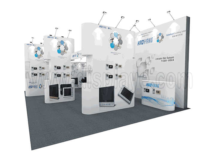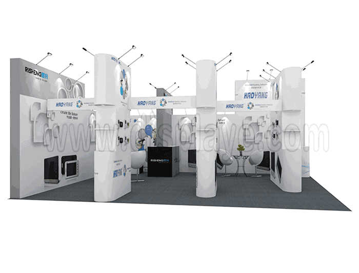 如你想?yún)⒄者@設(shè)計圖DIY設(shè)計構(gòu)思你想要的展臺,此造型結(jié)構(gòu)適用6x9m以下方形展位,你可增加你想要的展示功能或更多的引人注目特裝造型。