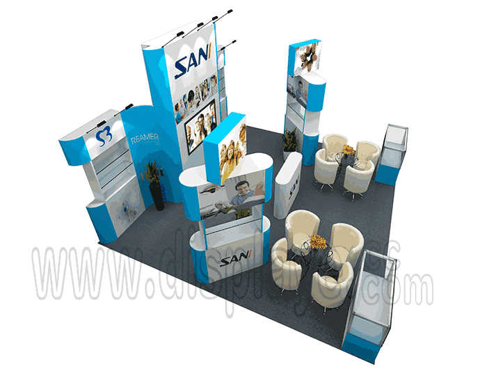 如你想?yún)⒄者@設(shè)計(jì)圖DIY設(shè)計(jì)構(gòu)思你想要的展臺(tái),此造型結(jié)構(gòu)適用6x6m以下方形展位,你可增加你想要的展示功能或更多的引人注目特裝造型。