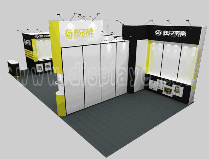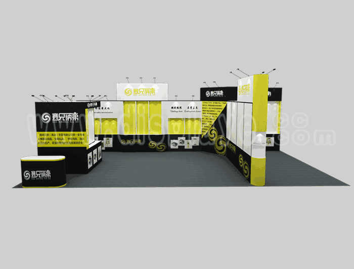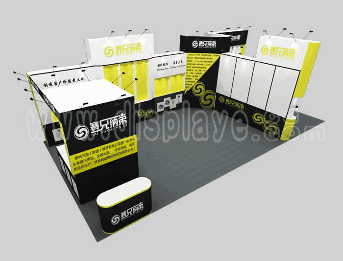 如你想?yún)⒄者@設(shè)計(jì)圖DIY設(shè)計(jì)構(gòu)思你想要的展臺(tái),此造型結(jié)構(gòu)適用 6x12m以下方形展位,你可增加你想要的展示功能或更多的引人注目特裝造型。
