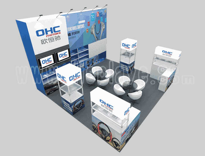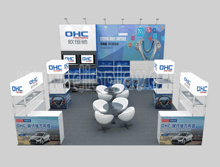 如你想?yún)⒄者@設(shè)計(jì)圖DIY設(shè)計(jì)構(gòu)思你想要的展臺(tái),此造型結(jié)構(gòu)適用 6x6m以下方形展位,你可增加你想要的展示功能或更多的引人注目特裝造型。