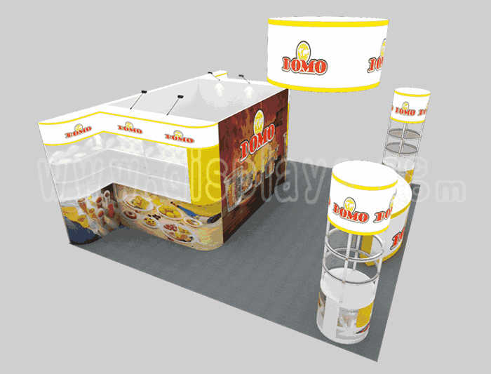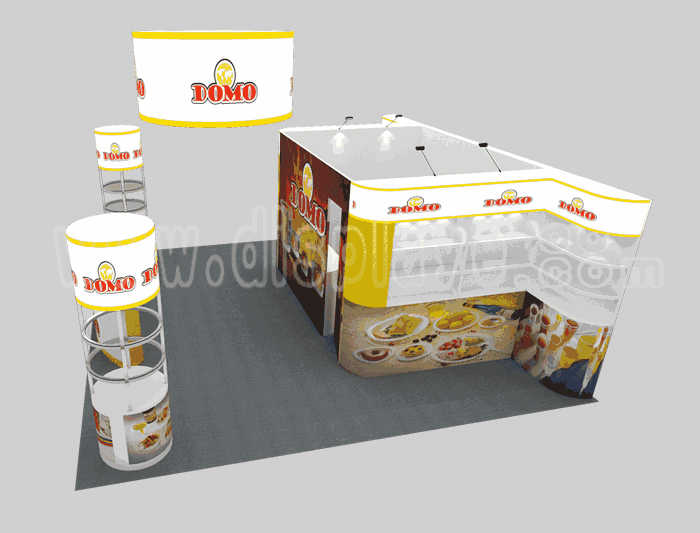 如你想?yún)⒄者@設(shè)計(jì)圖DIY設(shè)計(jì)構(gòu)思你想要的展臺(tái),此造型結(jié)構(gòu)適用 6x6m以下方形展位,你可增加你想要的展示功能或更多的引人注目特裝造型。