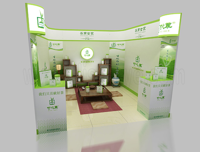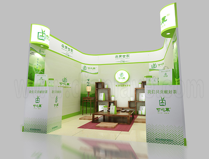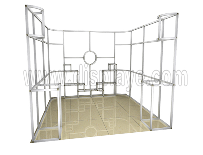溫馨提示:如你想?yún)⒄者@設(shè)計圖DIY設(shè)計構(gòu)思你想要的百變展臺,此造型結(jié)構(gòu)適用3x3m以下方形展位,你可增加你想要的展示功能或更多的引人注目特裝造型。